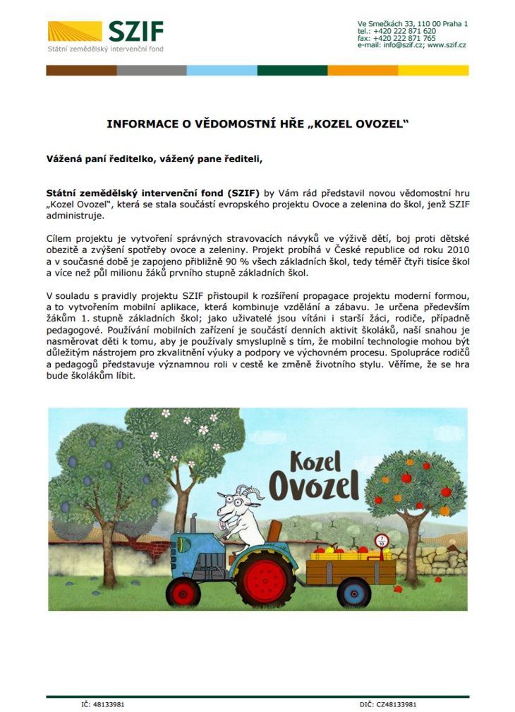 Informace k vědomostní hře vytvořené pro projekt Ovoce a zelenina do škol "Kozel Ovozel"